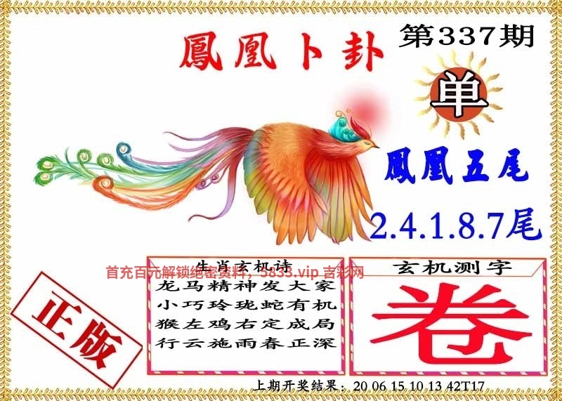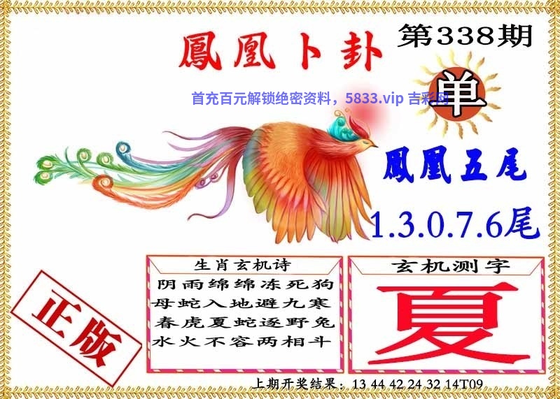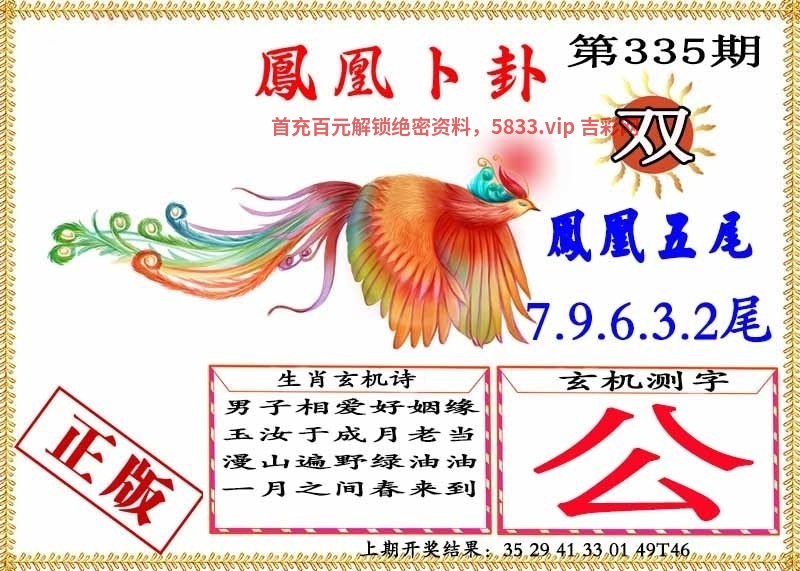 | 335期:玄机测字【公】开:狗44 玄机七肖:虎马鸡羊蛇狗龙 卜卦单双:双数 |