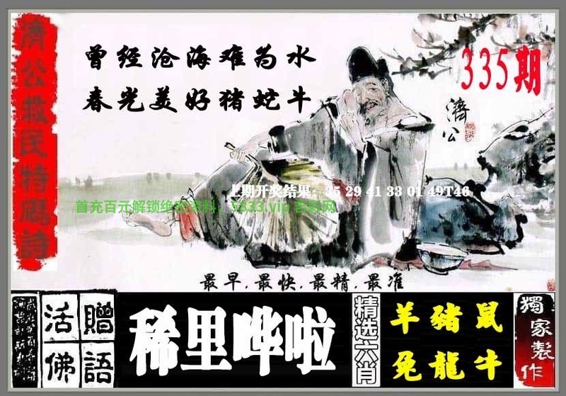 | 337期:济公特码诗 呈娇献嵋流动情,毒辣透顶性凶残。 解:猴鼠鸡龙虎猪。 活佛赠语:【快快活活】 解:龙马 七肖:猴鼠鸡龙虎猪马 五肖:猴鼠鸡龙虎 三肖:猴鼠鸡 |